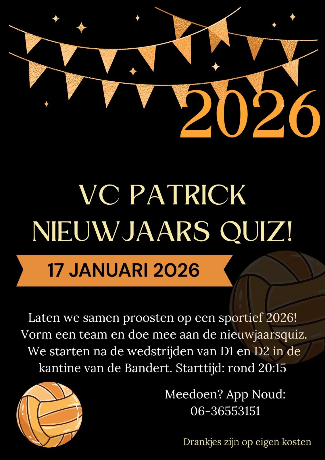 VC Patrick ✨🏐 De Actico nodigt alle Nevobo-teams, recreanten en het bestuur van harte uit voor de Nieuwjaarsquiz op 17 januari 2026! Na de wedstrijden van D1 en D2 maken we er samen een gezellige en sportieve avond van in de kantine van De Bandert. 👉 Let op: deze uitnodiging is niet voor de Volleystars Vorm een team en doe mee! Aanmelden kan via Noud: 06-36553151 We hopen jullie daar te zien! 🥂🎉 Actico VC Patrick